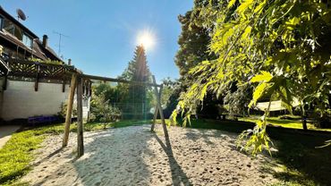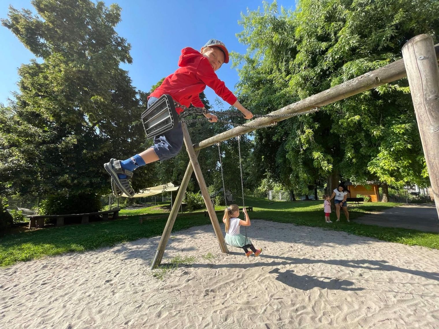 Neben dem vielfältigen räumlichen Angebot, auch ein Bewegungsraum gehört dazu, verfügen wir für unsere Kinder über ein sehr großes, naturell gestaltetes Außengelände. Hierzu gehören zwei große Schaukelanlagen, eine Rutschbahn, zwei große Sandbereiche, ein Wasserspielbereich, ein großes Holzspielzeughaus, ein Weidentunnel und ein Jugendfußballtor.
