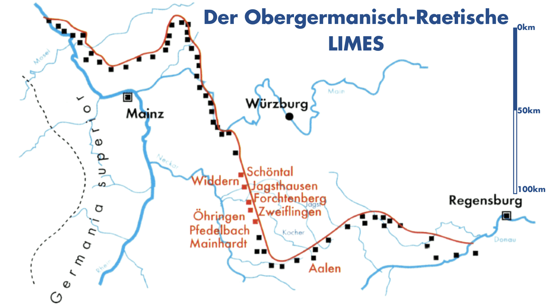 Der Limes wurde im 2. Jahrhundert n.Chr. von Römischen Kaisern geschaffen und verläuft zwischen Rheinbrohl und Neustadt an der Donau und durchquert von Nordwesten nach Südosten die Bundesländer Rheinland-Pfalz, Hessen, Bayern und Baden-Württemberg. Entlang der Strecke reihen sich insgesamt etwa 900 Wachtürme sowie 120 größere und kleinere Kastellplätze aneinander.