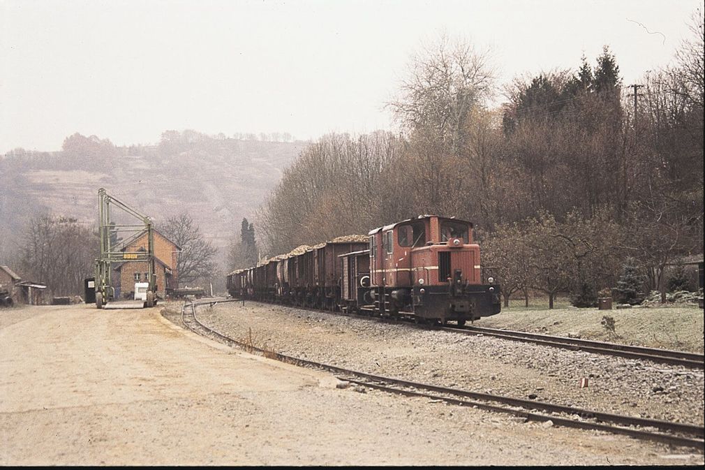 Das Dia 03388 ist im November 1985 entstanden und zeigt den an einem Samstagmorgen nach Möckmühl fahrenden Zug beladen mit Zuckerrüben. Die beladenen normalspurigen Güterwagen laufen auf schmalspurigen Rollböcken. In Möckmühl wurden die Wagen "abgebockt" und die Bundesbahn übernahm die Weiterbeförderung in die Zuckerfabrik in Offenau. Das hohe Güteraufkommen während der Zuckerrübensaison machte es notwendig, dass auch an Samstagen gefahren wurde.